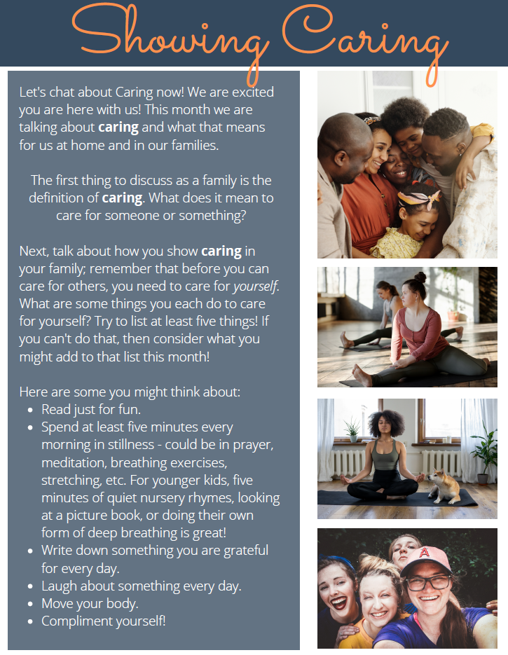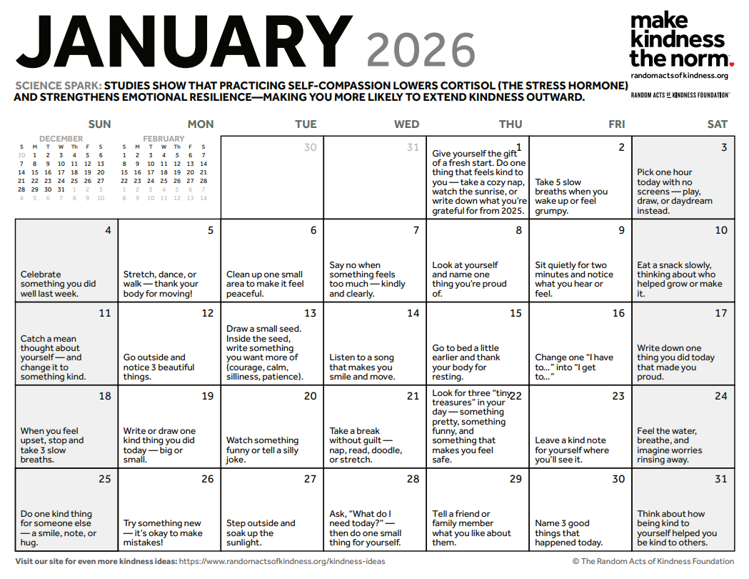 The Kindness in the Classroom program includes 6 kindness concepts focusing on responsibility, respect, caring, inclusiveness, integrity, and courage. We encourage you to take a look a the free lessons on the website - www.randomactsokindess.org so you can follow along with what our students are learning in the classroom