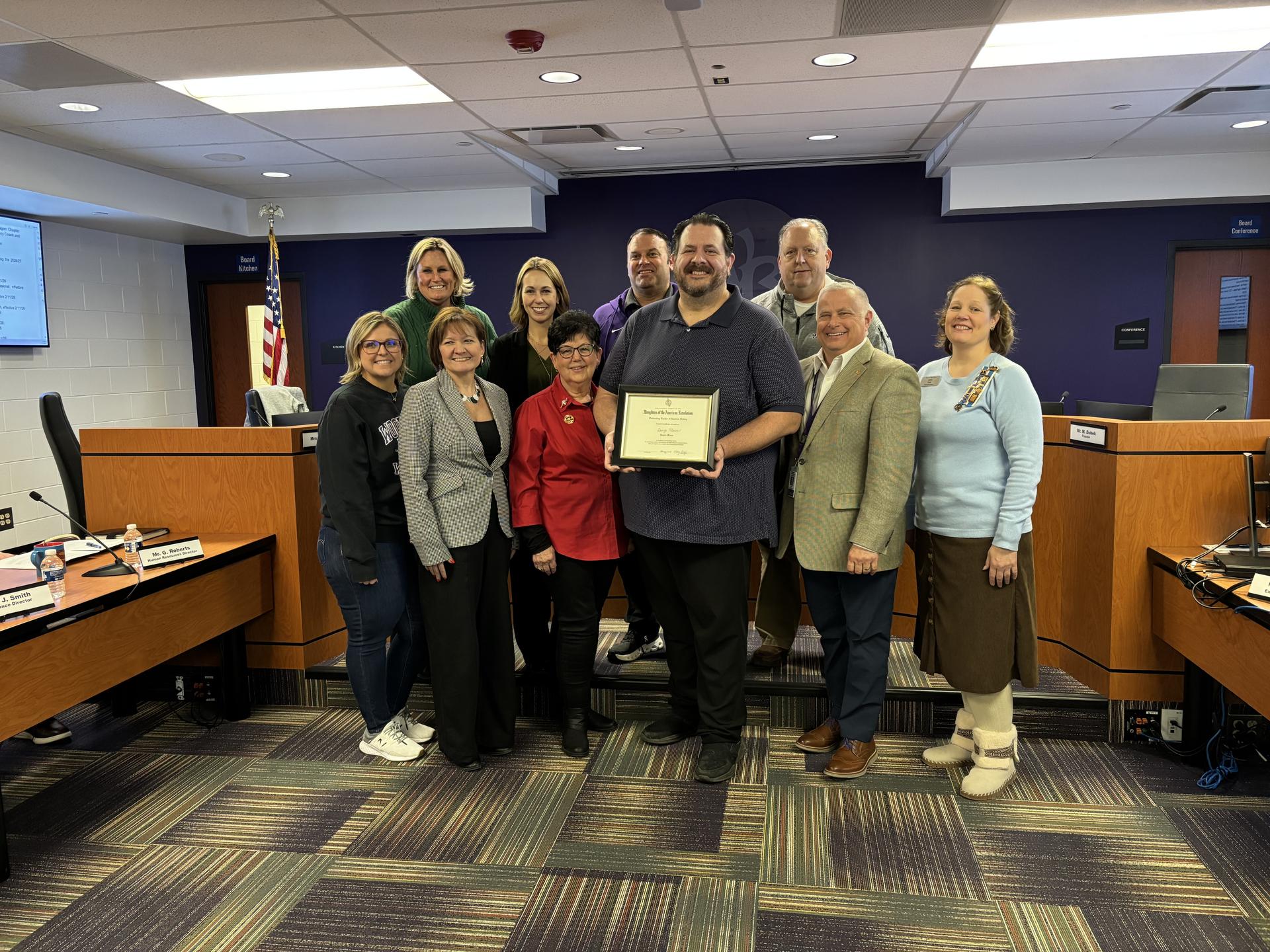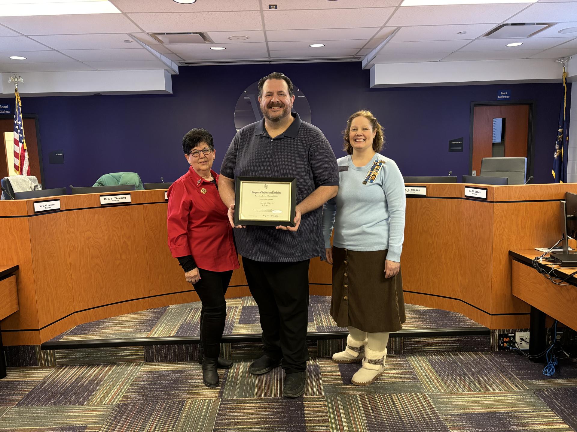 Brownstown Middle School teacher George Hloros was honored during the February 10 Woodhaven–Brownstown Board of Education meeting for his exceptional dedication to teaching American history — a commitment that has now earned him statewide recognition. Representatives from the Daughters of the American Revolution (DAR), including Monguagon Chapter Regent Kathy Gray, Vice Regent Brenda Tomblin, and Librarian Phylis Mikulin, were present to recognize Hloros as the chapter’s nominee for Outstanding Teacher in American History.