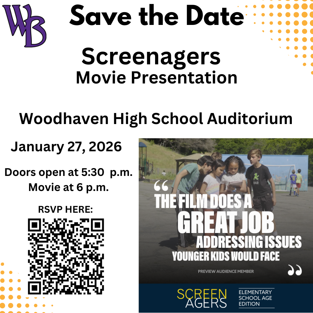 Families are also invited to attend a free screening of Screenagers at Woodhaven High School. This documentary takes a closer look at how screen time impacts children’s learning, attention, friendships, and overall well-being. The film offers research-based strategies to help parents set boundaries, encourage healthy habits, and start meaningful conversations about technology use. Please RSVP to save your spot with the QR code above.